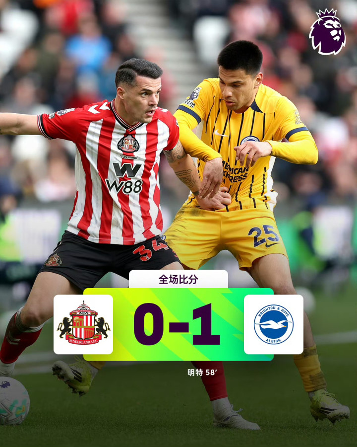 北京时间3月14日23:00,英超联赛第30轮,桑德兰主场对阵布莱顿。下半场第58分钟扬库巴-明特破门打入制胜球。最终比分桑德兰 0-1 布莱顿。