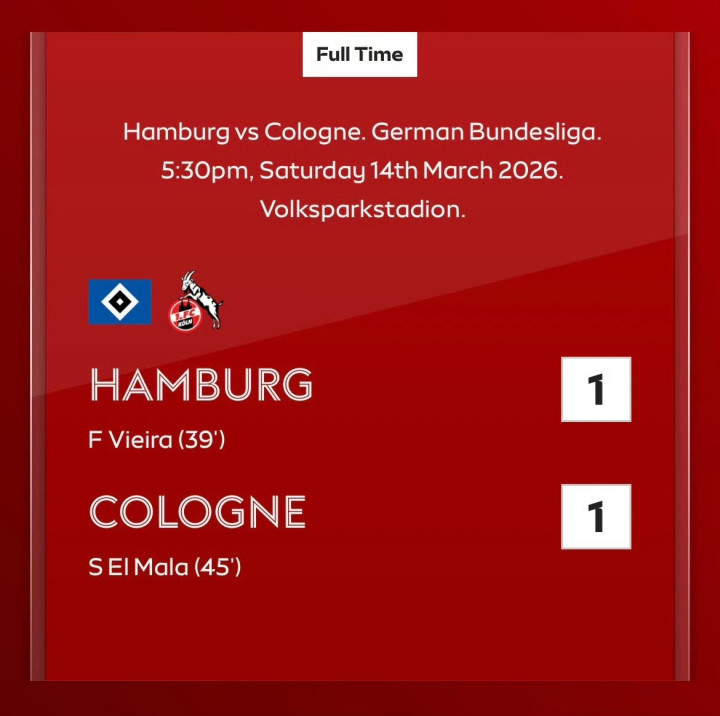 北京时间3月15日01:30,德甲联赛第26轮,汉堡主场对阵科隆。第39分钟,汉堡球员迈克尔布伦西斯助攻法比奥-维埃拉打破僵局。第45分钟,科隆球员拉夫-范登贝尔赫助攻赛义德-马拉打入扳平一球。最终比分汉堡 1-1 科隆。