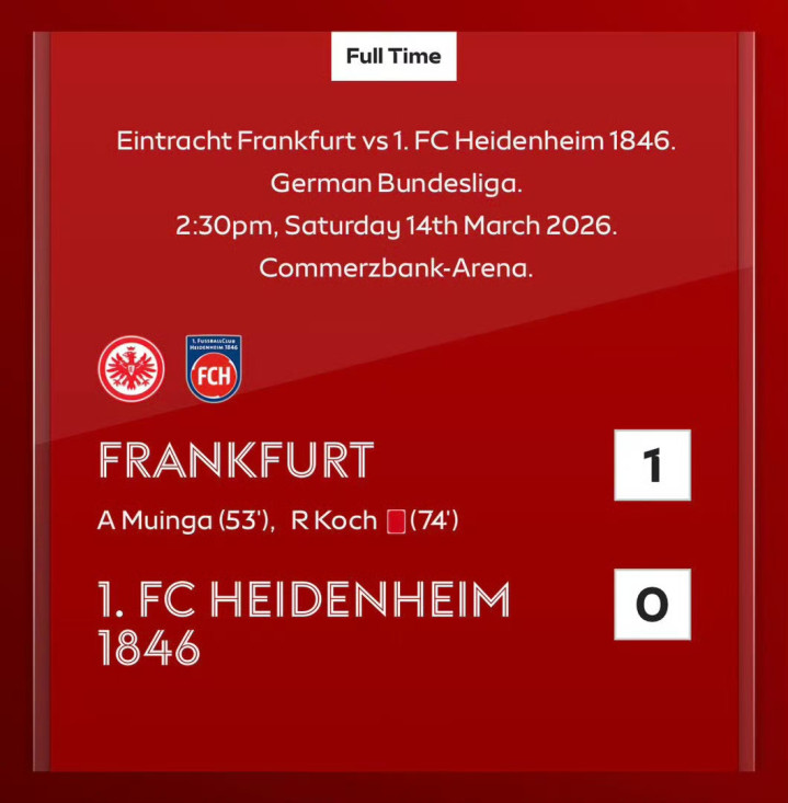 北京时间3月14日22:30,德甲联赛第26轮,法兰克福主场对阵海登海姆。下半场第53分钟卡利穆恩多打破僵局,第73分钟科赫防守犯规两黄变一红被罚下场。最终比分法兰克福 1-0 海登海姆。