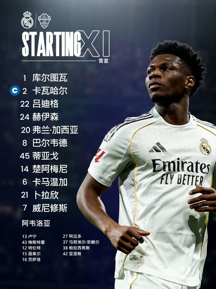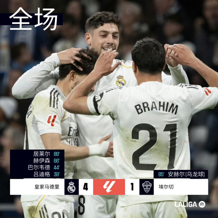 北京时间3月15日04:00,西甲联赛第28轮,皇马在主场伯纳乌球场迎战埃尔切。上半场,巴尔韦德任意球造险,吕迪格破门首开纪录,随后巴尔韦德扩大领先优势。皇马半场2-0领先埃尔切。易边再战,迪亚斯错失一次单刀良机,随后赫伊森破门,曼努埃尔·安赫尔打进一粒乌龙球,居莱尔超远距离吊射破门。最终皇马4-1击败埃尔切,本轮皇马先赛暂落后榜首1分。