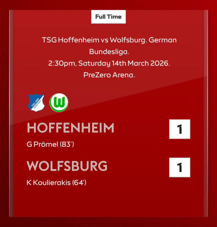 北京时间3月14日22:30,德甲联赛第26轮,霍芬海姆主场对阵沃尔夫斯堡。霍芬海姆普罗梅尔破门。沃尔夫斯堡库列拉基斯破门。最终比分霍芬海姆 1-1 沃尔夫斯堡。